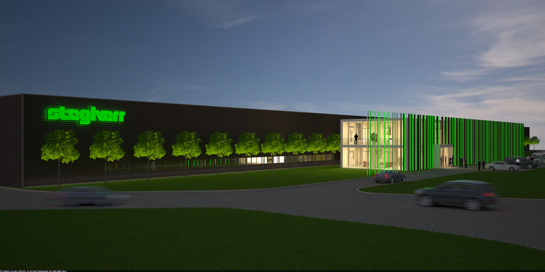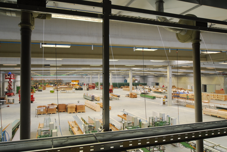 Werksanlage mit Verwaltungsgebäude für die Extrusion von Kunststoffprofilen. Das weit gespannte Hallentragwerk in Stahlbeton Fertigteilen bietet flexiblen Raum für den parallelen Betrieb von 24 Extruderstraßen.
