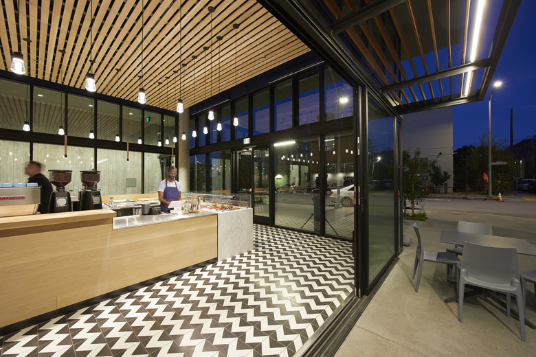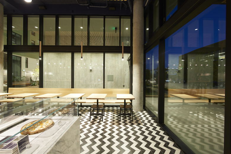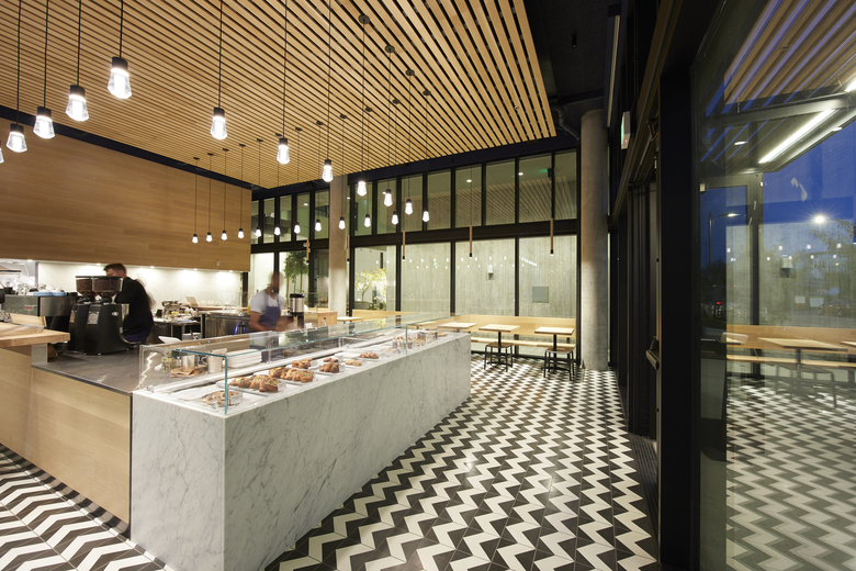 At Noon All Day, a relaxed restaurant and café in San Francisco’s Dogpatch neighborhood, refined materials come together with playful details to create a space that allows for both a quick and casual afternoon pick-me-up as well as more laid-back, long lunches. Tile flooring traces a zig-zag black-and-white pattern across the entire space, marking a lively rhythm that reflects the activity on the surrounding streets. Overhead, thin strips of warm wood barely spaced apart set a slower pace and make a drop-ceiling from which Edison-bulb pendants hang, following the perimeter of the service counter.
