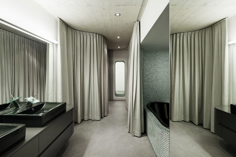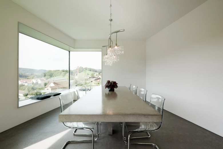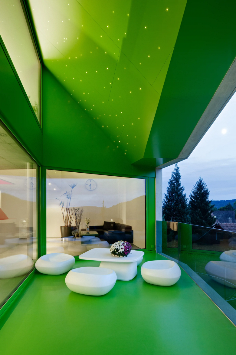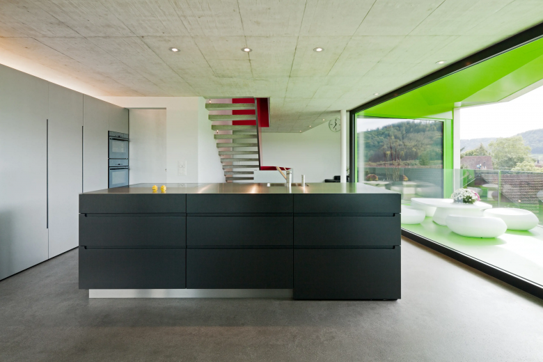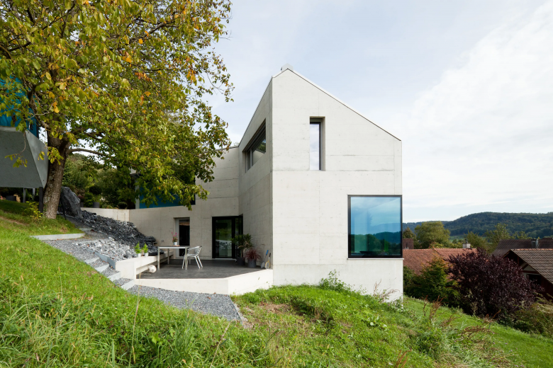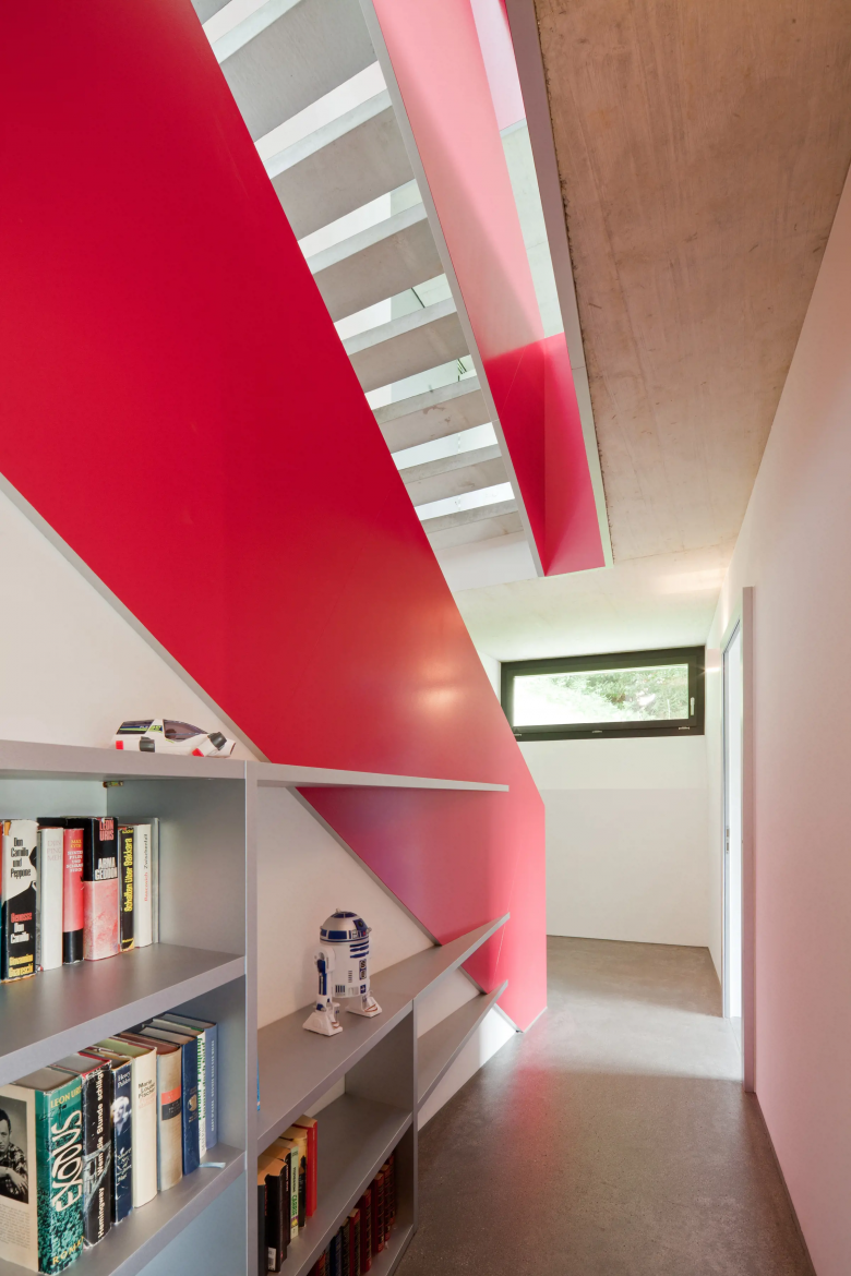 Wie ein Fels thront der monolithische Baukörper am Hang und weist seiner Terrasse den Platz vor dem bestehenden Nussbaum zu. Von der Strasse her betritt man das Gebäude über das Obergeschoss, und über die Treppe, die sich als rotes Band durch das Haus zieht, gelangt man in die beiden Wohnebenen. Die überhohe Loggia schafft interessante Durchblicke und Raumbeziehungen.