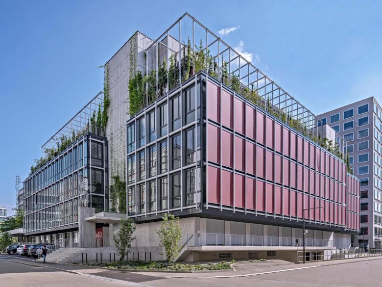 Die Grundhaltung «Reuse, Reduce, Revaluate» definiert die Entwurfsparameter. Durch gezielte architektonische Eingriffe werden Adressierung, Ausdruck und die innere Organisation des Bestandes neugestaltet. Das Bauwerk wird auf die bestehende Tragstruktur zurückgebaut und darin ein bis ins EG freigelegtes Atrium ausgeschnitten. Dieses bildet das gemeinschaftliche Zentrum der Anlage. Die bestehenden Auskragungen im Hochparterre werden zu eigentlichen Verladerampen fürs Gewerbe umfunktioniert. Das Gebäude wird dreiteilig gegliedert; Auf dem eingezogenen EG kragt ein dreigeschossiger Baukörper mit einer leichten, verglasten Curtain-Wall Fassade. Darauf ordnen sich jeweils zurückspringend die Attika-Geschosse mit üppig begrünten Dachgärten stufenweise an. Erneut zurückgestaffelt bildet eine hölzerne Aufstockung den Abschluss der Volumetrie.
