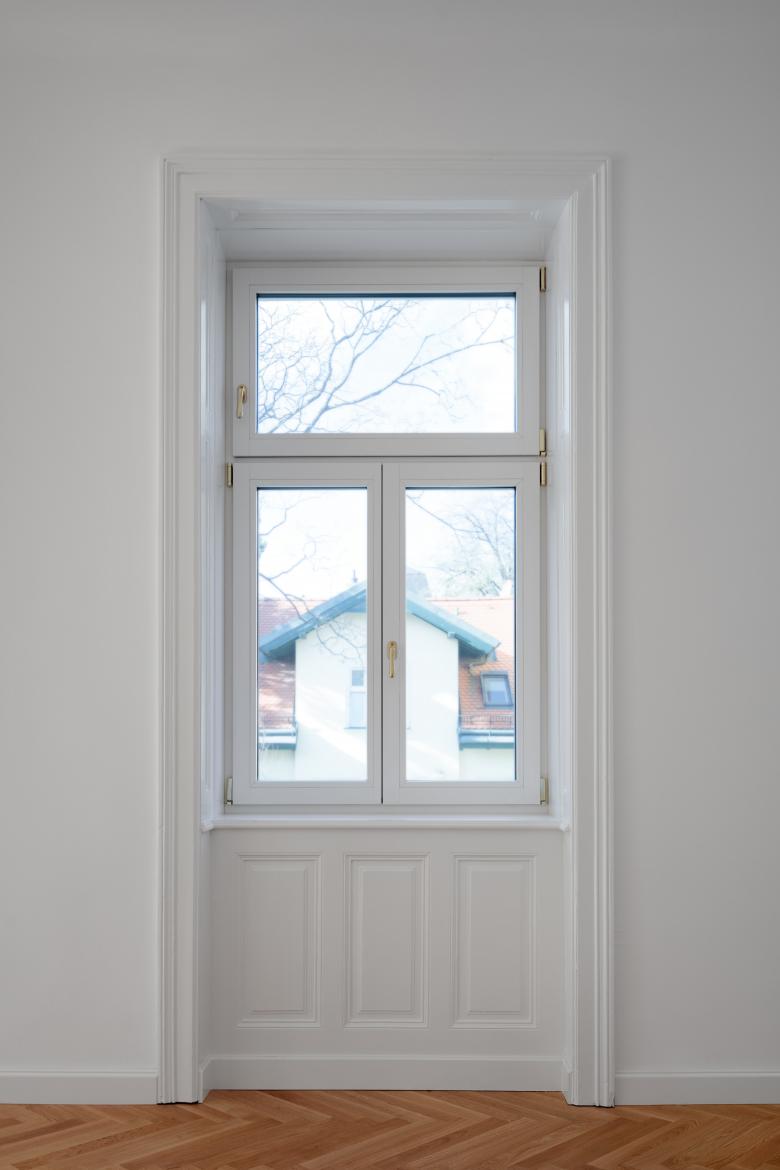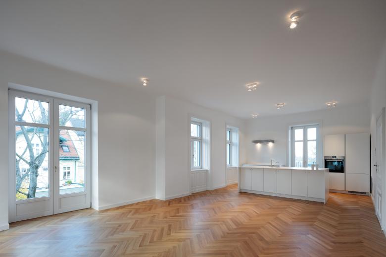 Ausgangslage war eine Jahrhundertwendevilla mit 2 Geschoßwohnungen; im Hochparterre und im 1. Stock. Aufgrund der Anforderung der Barrierefreiheit seitens der Eigentümer wurden das Hochparterre und der Keller zu einer Wohneinheit zusammengefasst.