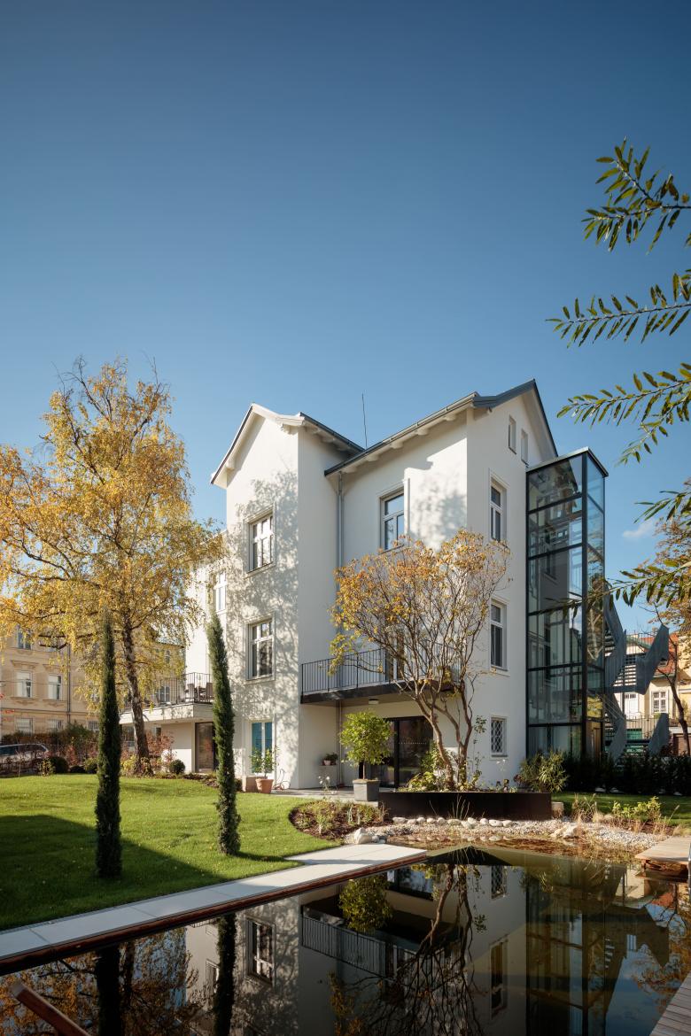 Wegen der Hanglage war es möglich die Niveaus so zu koordinieren, dass nun der Eingang ins Gebäude nicht mehr über ein Zwischenpodest, sondern direkt in der unteren Ebene erfolgt. Die Räume der unteren Ebene (des ehemaligen Kellers) wurden durch die direkte Verbindung in den Garten massiv aufgewertet. Eine Trockenlegung erfolgte mittels Durchschneidens der Mauern sowie zusätzlich einer Drainagierung. Die beiden Geschoße sind mittels einer internen Stiege sowie über einen an der Nordseite angebauten Lift verbunden. Ebenfalls an der Nordseite wurde auch eine Treppenturm errichtet, über welchen nun die oberste Ebene als eigenständige Wohneinheit, erreichbar ist. Dadurch konnten die Flächen des ehemaligen Stiegenhauses in allen 3 Ebenen für die, ideal übereinander gelegenen, neuen großzügigen Badezimmer verwendet werden. Die Fassaden bzw. die Fensteröffnungen wurden neu geordnet, da über die vergangenen Jahrzehnte einige Öffnungen geschlossen bzw. verändert worden waren. An 4 Stellen wurde neue Balkone bzw. Terrassen errichtet.