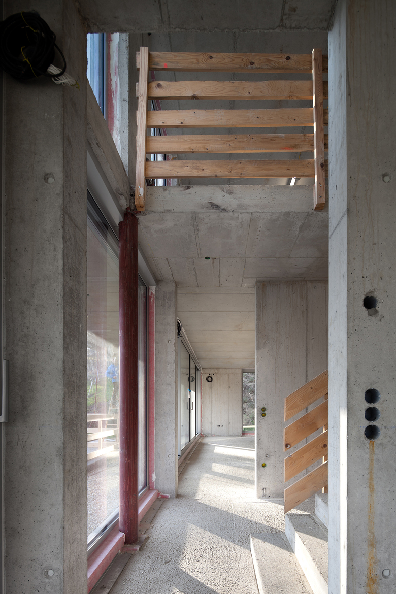 Das Erdgeschoß dient als Wohn-, das Obergeschoß als Schlafebene. Zusätzlich gibt es auf dem Flachdach auch noch ein Atelierzimmer. Alle Ebenen sind mit einem Personenaufzug verbunden.