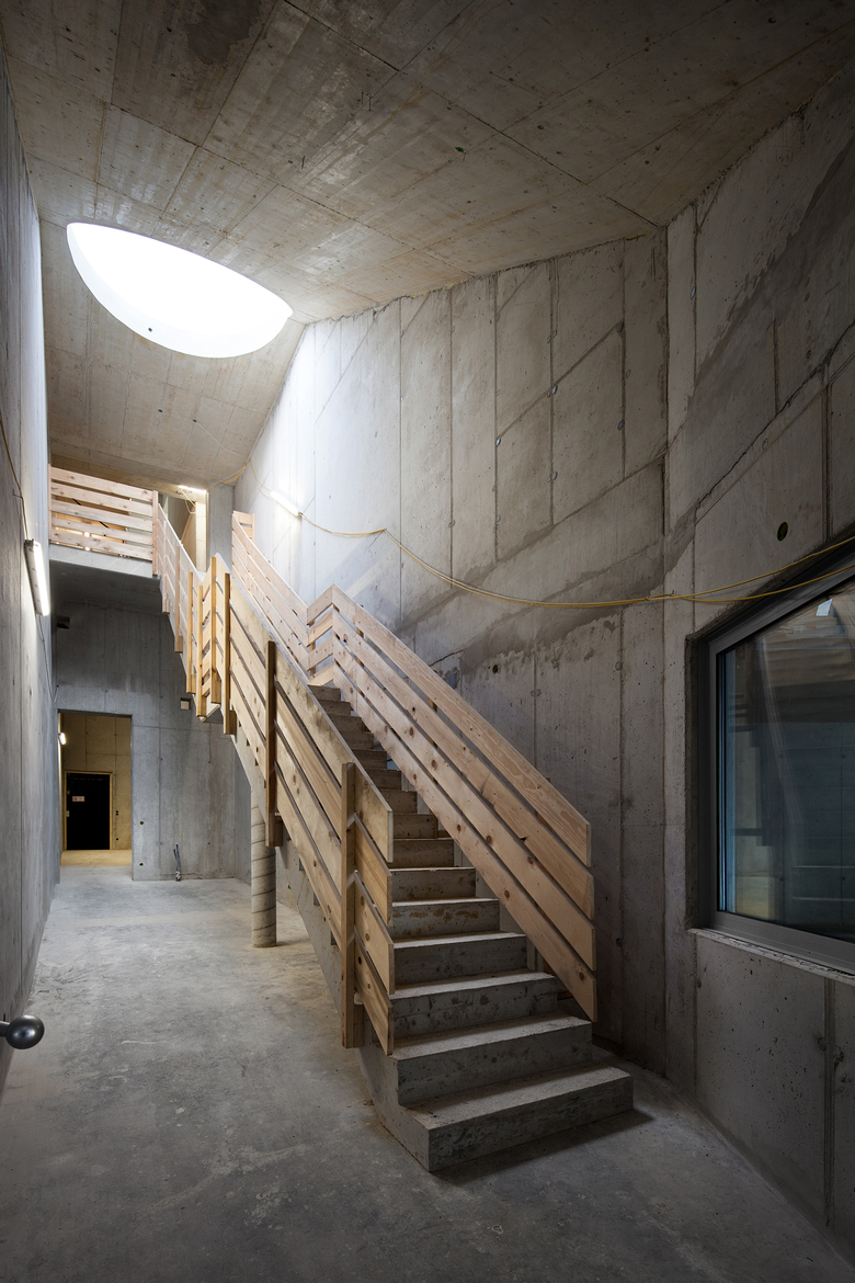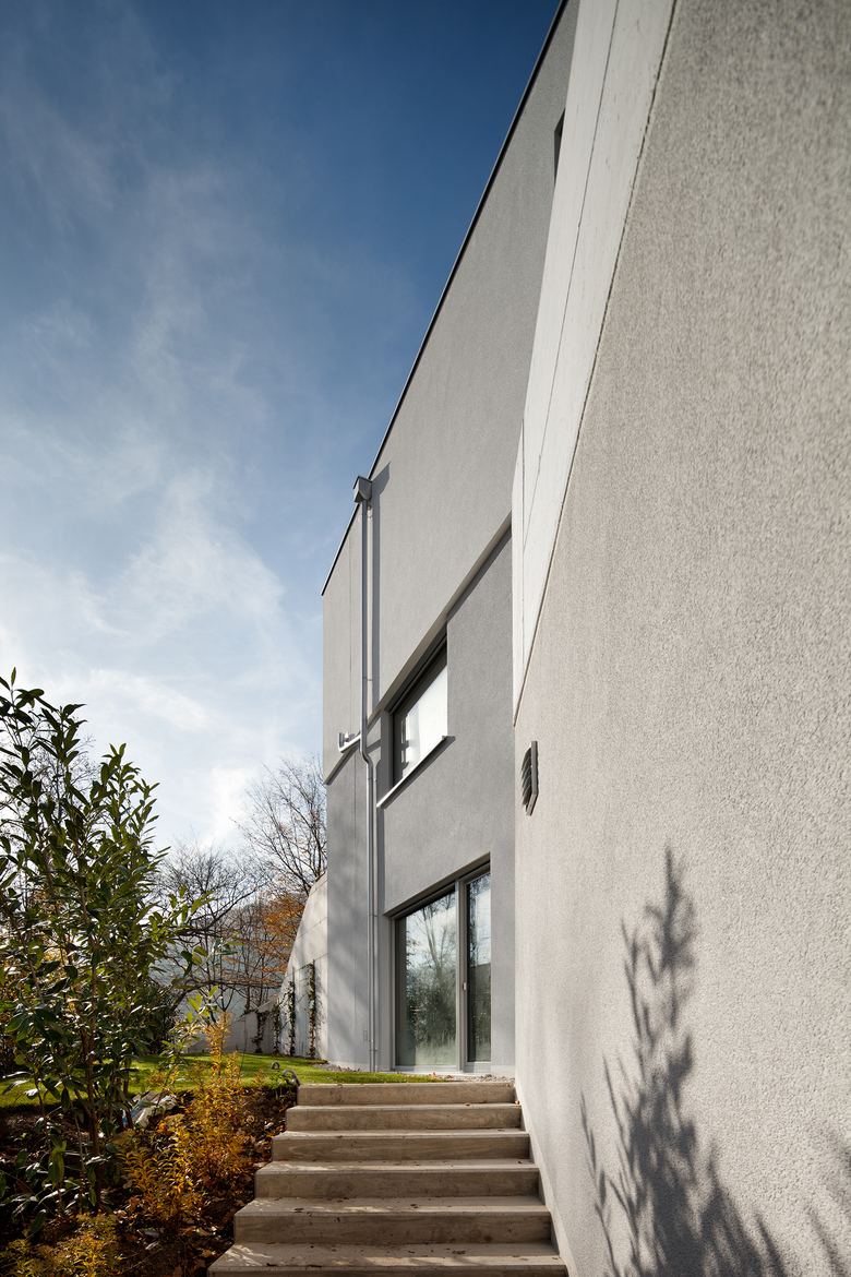 Aufgrund der Hanglage wurde für alle 4 Häuser eine Typologie entwickelt bei welcher der Zugang ins Haus im Souterrain erfolgt. Ebenso der Nebeneingang von der (in den Hang eingegrabenen) Garage. Im Souterrain befinden sich neben Technik- und Lagerräumen auch Aufenthaltsräume, welche hangabwärts liegend Terrassentüren ins Freie haben und als eigene Wohneinheit genutzt werden könnten.