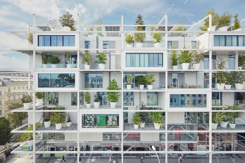 Bäume in der Fassade und am Dach beeinflussen das Mikroklima spürbar. Durch die dreidimensionale Bespielung mit Bäumen sind mehr Pflanzen vorhanden, als dies auf der Grundfläche möglich wäre. Eine der wichtigsten Maßnahmen im „Urban Heat Island-Strategieplan“ der Stadt Wien ist die Begrünung. Die Rankpflanzen und Bäume des IKEA Einrichtungshauses wirken kühlend und befeuchtend – eine natürliche Klimaanlage. Auch auf der Fußgängerebene wird so die Lufttemperatur verbessert. Computersimulationen ergaben eine relevante Temperaturabsenkung von 1,5 °C.