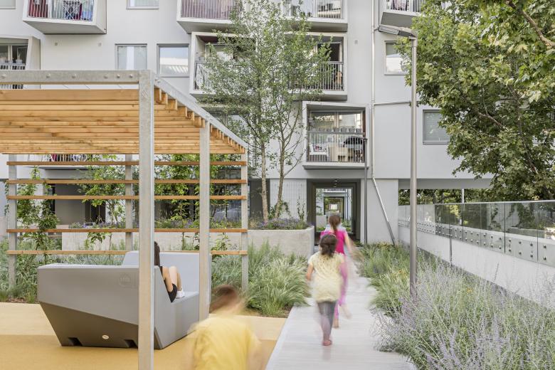 Die aktivierte Wohngasse, die zwischen den Bestandsgebäuden und den Neubauten verläuft, ist sowohl verbindendes als auch gliederndes Element für die gesamte Anlage. Über großzügige Freitreppen gelangt man auf den gemeinsamen Aussenraum. Die gut 400m lange begrünte Verbindungsplattform bietet kommunikative Aufenthaltszonen und Freiflächen zum verweilen, bewegen und gärtnern und verbessert die Anbindung an die Umgebung.