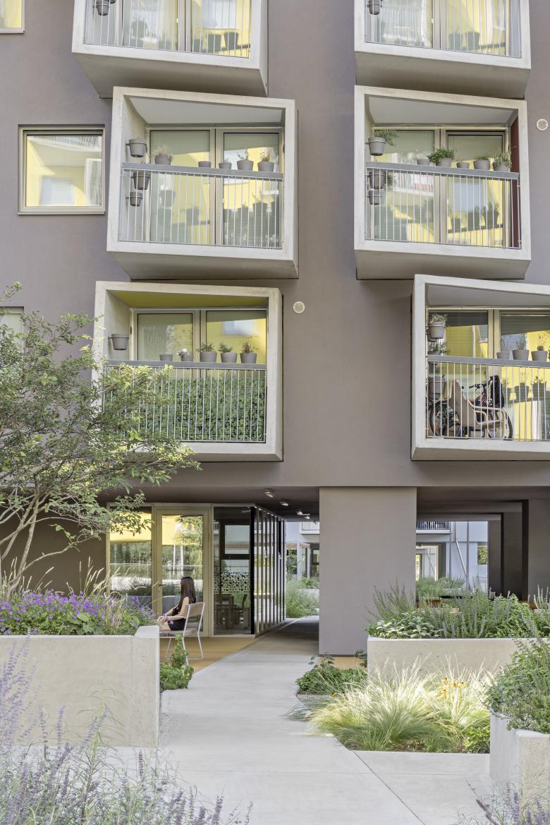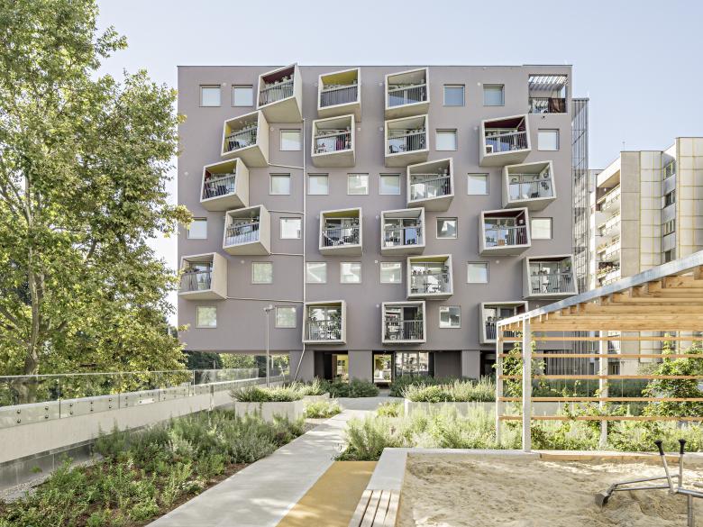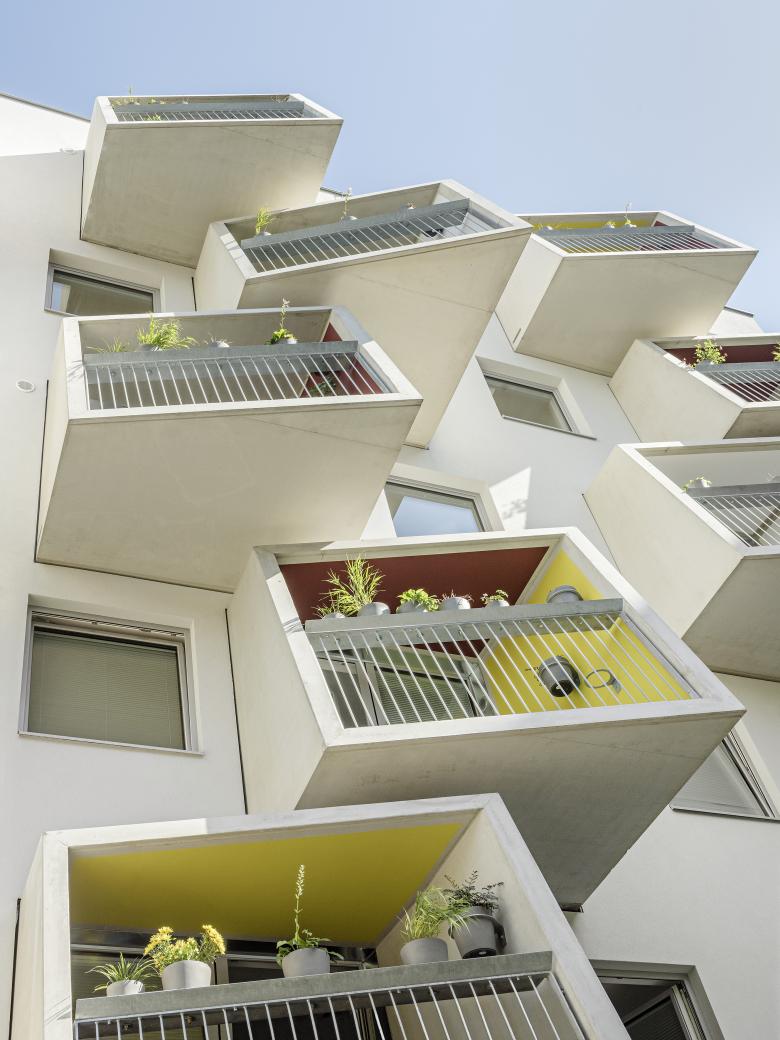 Das vielleicht auffälligste Merkmal der neuen Wohnanlage sind die auskragenden Loggien. Diese vorgefertigten Betonelemente sind an der nordwestlichen und südöstlichen Fassade jedes Gebäudes angebracht. Durch die Schwenkung wird der Blick nach außen und in den privaten Bereich bewusst auf die Donau gelenkt. So bleibt der Außenraum privat und der besondere Blick erhält die Aufmerksamkeit, die dieser Ort erfordert.