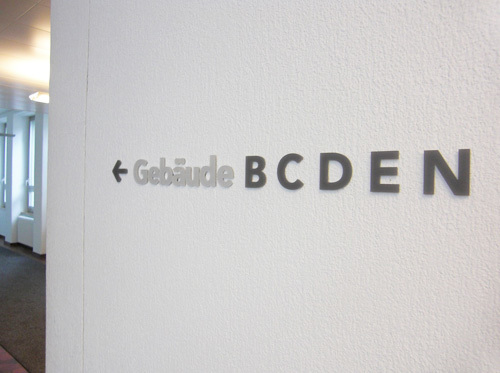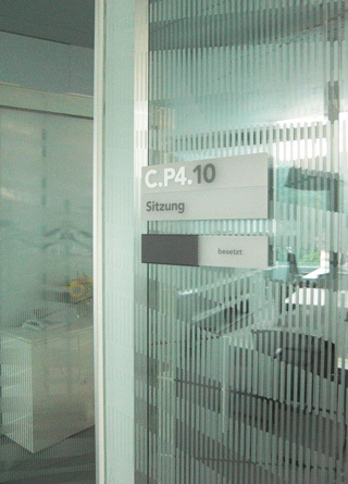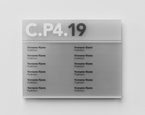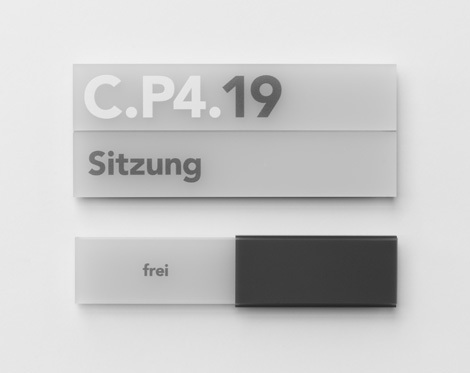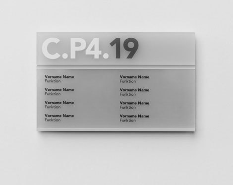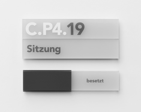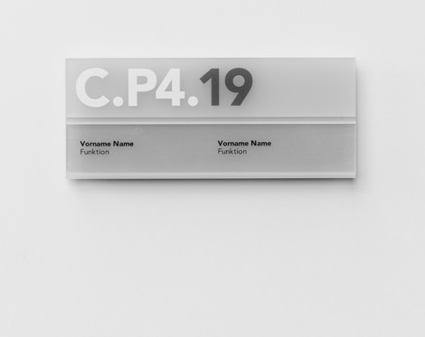 Entwicklung der Wegleitung, Stockwerkbeschriftungen und Raumbeschriftungen für die neuen Büroräumlichkeiten der Axpo AG. Das Tafelsystem mit austauschbaren Elementen gewährleistet eine flexible Raumnutzung.