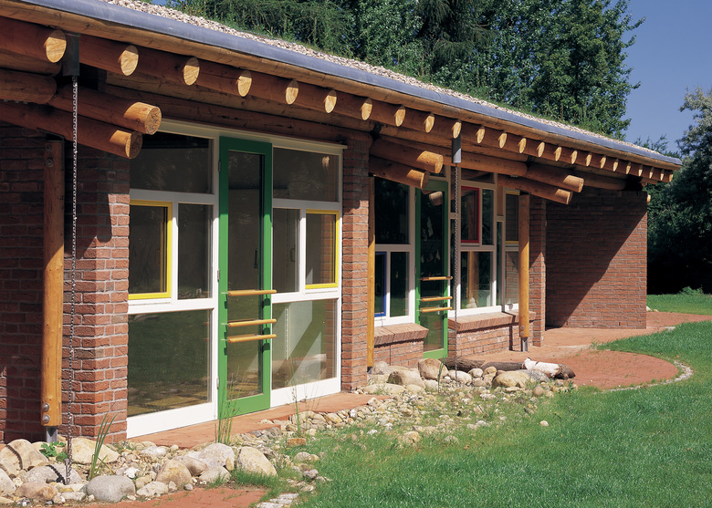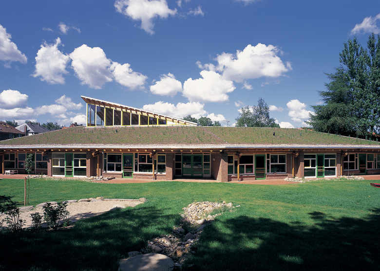 Das Gebäude wirkt, als sei es direkt mit der Natur verbunden und bietet kleinen wie auch großen Besuchern eine einmalige Atmosphäre. So können die Kinder die Haptik und Wärme der Hölzer erspüren und eins-zu-eins den Einsatz natürlicher Ressourcen erleben. Die Dächer sind mit einem natürlich bepflanzten Gründach versehen.