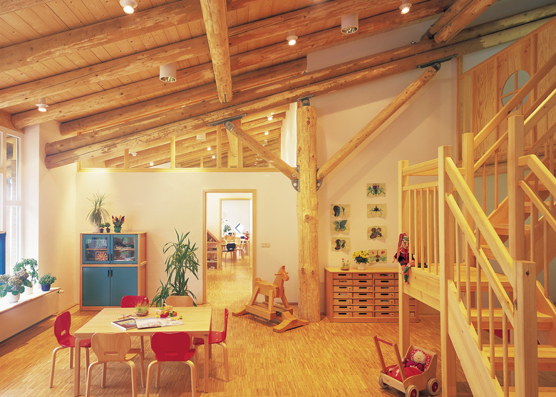 Großer Wert wurde auf den Einsatz von natürlichen und ökologischen Materialien gelegt. So wurde der Kindergarten fast vollständig aus Naturressourcen wie Holz gebaut und mit einem in der Region typischen rotbraunen Backstein verblendet. Ein besonderes Merkmal stellt die speziell entwickelte Dachkonstruktion aus naturbelassenen, geschälten und massiven Rundhölzern dar, welche von der Unterseite sichtbar gelassen wurde.