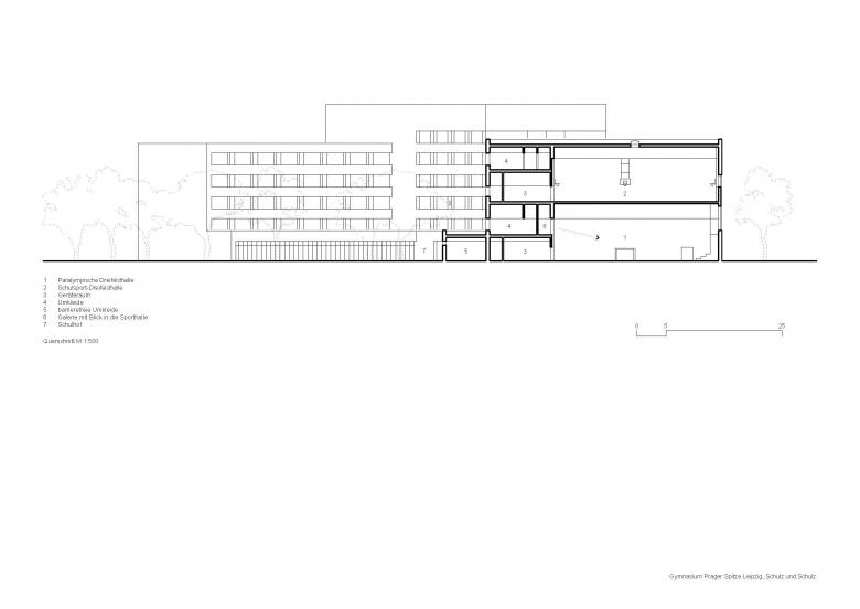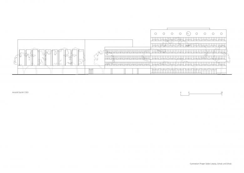 Der von der Straßenkreuzung hinter das Biotop zurückgesetzte Hochpunkt der Schule formuliert ein städtebauliches Zeichen und schafft einen neuen Orientierungspunkt im Stadtraum. Der Schulbaukörper orientiert sich vorrangig entlang der Prager Straße und bildet hier eine schützende und stadtraumfassende Raumkante zu der stark frequentierten Verkehrsachse Prager Straße. Die gestapelten Sporthallen entlang der Philipp-Rosenthal-Straße werden über einen zurückgesetzten Brückenkörper mit der Schule verbunden. Gebäudesetzung und Schulvorplatz bilden die Adresse der Bildungseinrichtung, während die Schul- und Sportfreiflächen im geschützten rückwärtigen Bereich angeordnet sind.