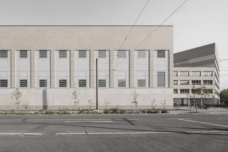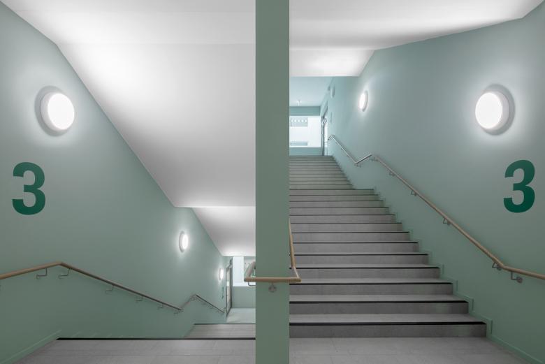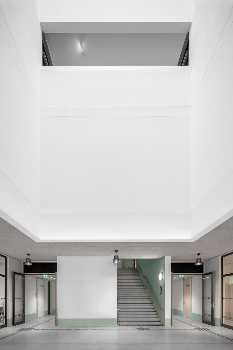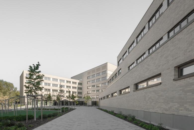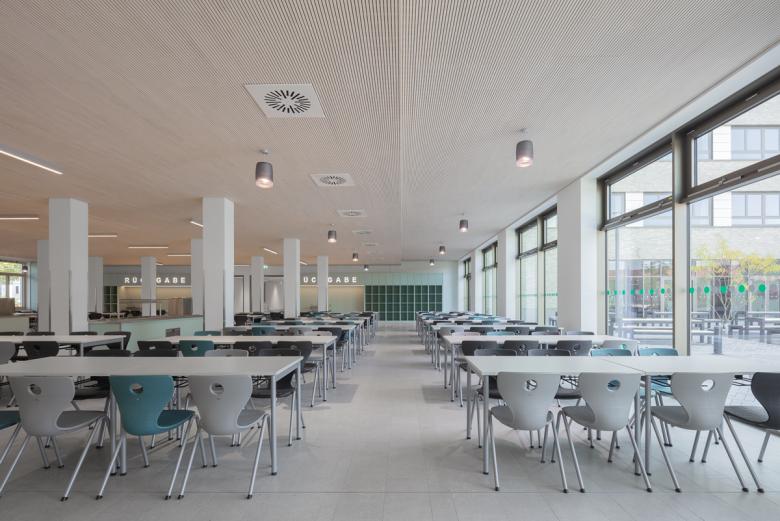 Die Architektur des Schulgebäudes folgt der funktionalen Gliederung des Inneren. Das Erdgeschoss beherbergt öffentliche Bereiche wie Foyer, Bibliothek, Mensa und Aula, die über großzügige Verglasungen eine Verbindung zum Stadtraum herstellen. In den Obergeschossen sind die Unterrichts- und Fachräume um zentrale Flurzonen angeordnet, die als offene Lernlandschaften gestaltet sind. Die Erschließung erfolgt über eine Scherentreppe, die zusammen mit den angrenzenden Lufträumen eine natürliche Belichtung über mehrere Etagen ermöglicht. Über ein zentrales Oberlicht wird Tageslicht in alle Etagen gelenkt, was die offene und kommunikative Atmosphäre im Gebäude unterstützt.