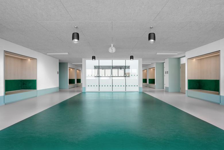Die obere Dreifachhalle umfasst eine sieben Meter hohe Kletterwand und bietet verschiedene Nutzungsmöglichkeiten für den Schul- und Vereinssport.