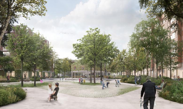 Der Quartierplatz stellt als öffentlicher Freiraum in der Arealentwicklung Volta Nord einen zentrumsbildenen Baustein dar. Er definiert sich als stadträumliches Bindeglied der Strassenräume, deren atmosphärische Qualitäten aus dem St. Johann-Quartier abgeleitet sind. Angelehnt an den Grundmustern des Quartierplatzes mit seiner klar begrenzten Aussenkante, steht er exemplarisch für einen Freiraum zukunftsweisender, nachhaltiger Entwicklungen. Den starken Rahmen des Platzes bildet ein vegetativer Saum, welcher im Biotopverbund mit der umliegenden Strassenbegrünung gedacht, ökologische und klimatologische Funktionen erfüllt. Meteorwasser wird im Sinne der Schwammstadt vor Ort gesammelt, versickert und in den Kreislauf zurückgeführt. Das Innenleben des Platzes definiert sich als Treffpunkt des Quartiers und gliedert sich in zwei typologisch unterschiedliche Bereiche. Eine multifunktional nutzbare Platzfläche mit Spielplatz im Norden sowie ein vielfältig nutzbarer Pavillon im Süden.