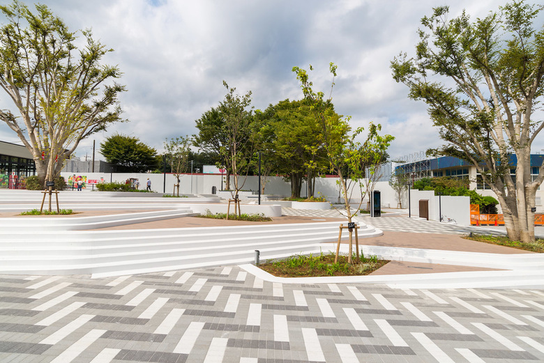 駅前の再開発に伴う駅前広場のデザインを担当しました。駅と街に約4mもの高低差が存在する南万騎が原駅は、これまで急な階段や坂道で駅と街が分断していました。そこで、駅と街を結ぶ緩やかなスロープを通した上で、それ以外の部分を棚田状の広場空間としてデザインしました。 段状につらなる幾つものスペースは、イベントをしたり、座って休んだりと、人が活動できるスペースとして生まれ変わりました。また、駅ができた頃から植えられている巨大な樹木をできるだけ残すことで、広場に良好な木陰をもたらしています。