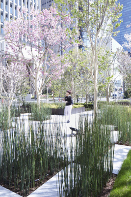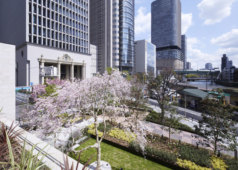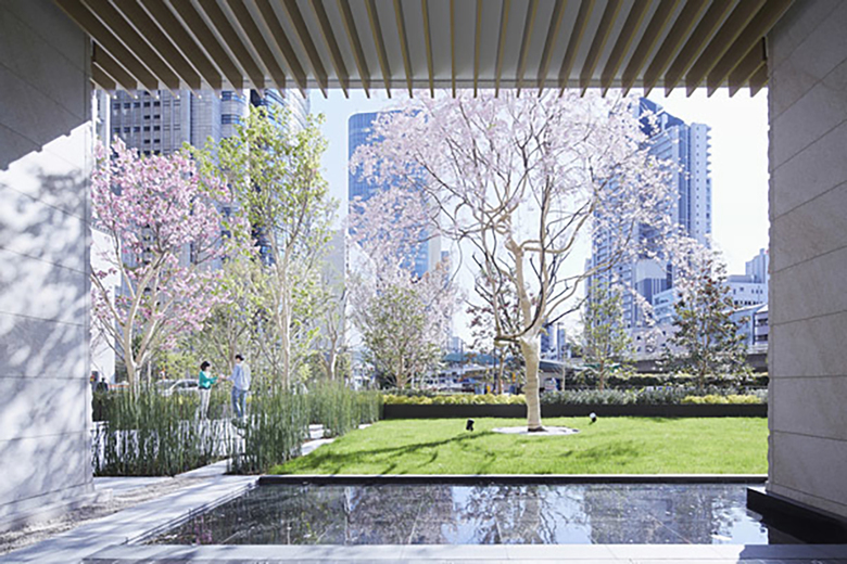 大阪を代表するビジネス街、中之島にオープンした「三井ガーデンホテル大阪プレミア」。「洗練された日本らしさ」をテーマにデザインを展開しました。私たちが目指したのは、日本料理の世界にある「かいしき」というおもてなしの形です。「かいしき」とは、器と料理の間に花や葉など生きた緑を添えて、季節を楽しむという作法で、そういった日本人ならではの洗練された気配りや癒しで満たされた風景を描こうと考えました。全て樹種の異なる厳選された桜の木をはじめ、風の動きや水面のきらめきを可視化するなど、繊細な自然の移ろいを、おもてなしの形として敷地全体に散りばめました。