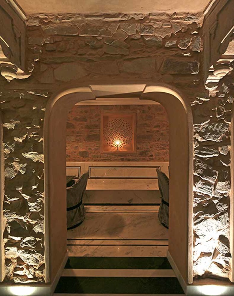 From structure to flooring to furniture units, stone masonry and inlay work have been given new expressions. The skilled artistry of local craftsmen in marble is given a graphic vocabulary for flooring, the Pavilion, dado work, benches, table tops and more. Marble benches line the deep verandahs enveloping the courtyard to create intimate dining spaces. Mild steel and brass are used for bespoke lighting and door design.