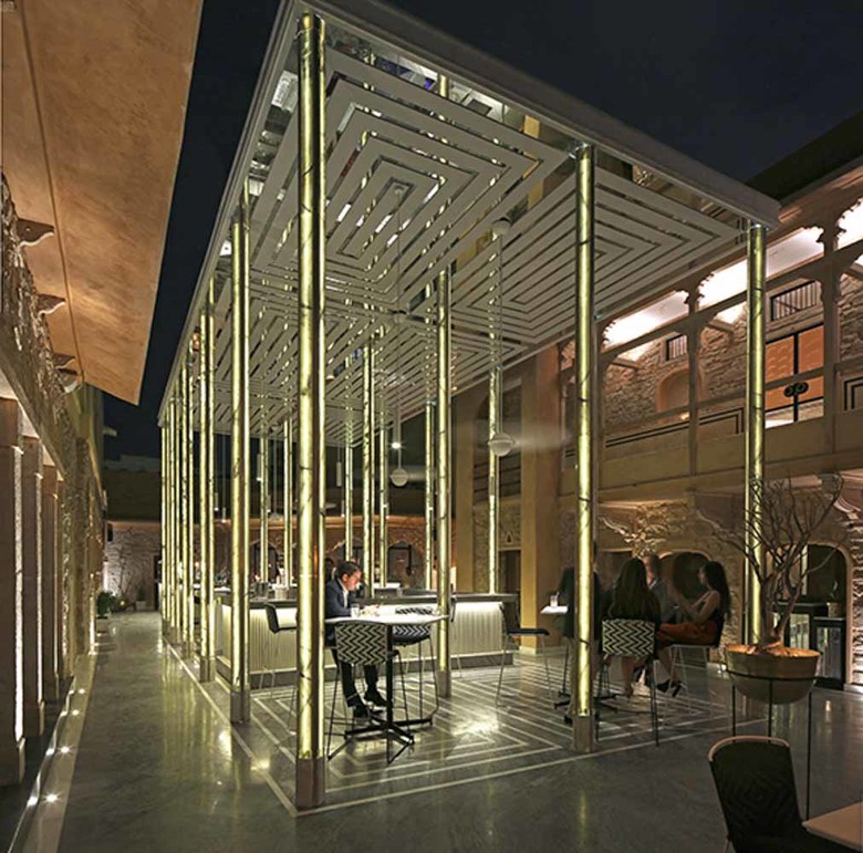 A key conceptual move was to use the courtyard as a binding element for the new program rather than just an extension of the restaurant. This meant dismantling an existing structure, being used as a toilet block, from the middle of the courtyard to open up the area both visually and spatially. A Pavilion in the form of a Baradari (literally translated - pavilion with 12 columns) was inserted in the form of a bar into the courtyard to divide yet link the two zones flanking it. Built in handcrafted marble and brass, the contemporary expression of the Baradari-inspired Pavilion heightens the surrounding historic vocabulary and gives the place its key identity.