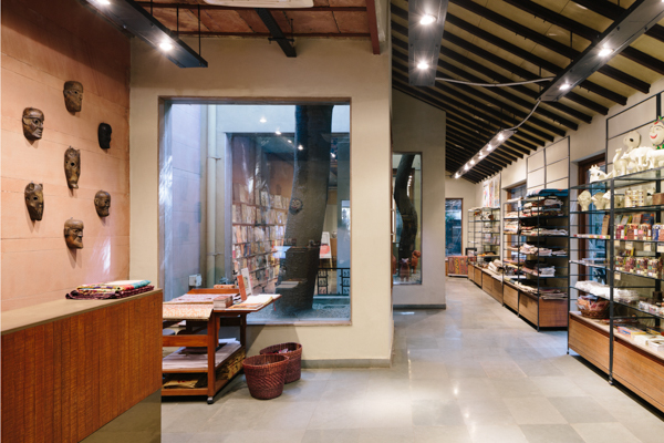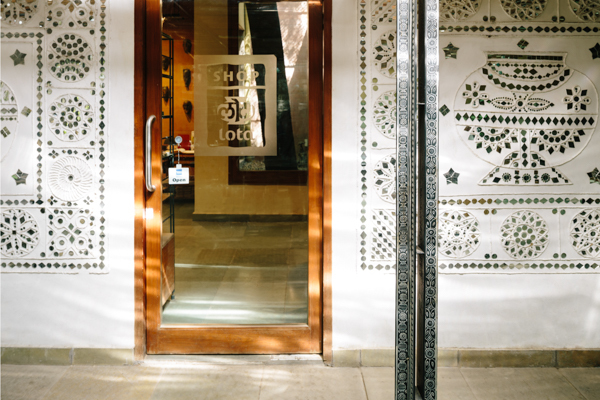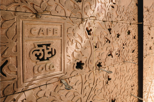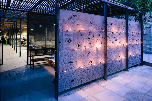 Café Lota is a natural extension of the Museum shop and is set in the negative space created by the boundary wall and the museum shop. A lightweight metal framework inserted into this odd volume ties the space together and creates nooks and portals for people to dine and converse in. Negative spaces are filled with plants to create a light and airy yet shaded enclosure that makes full use of the beautiful trees and painted walls that surround the eatery. A lightweight bamboo trellis of varying density brings dappled light into the space through the day.