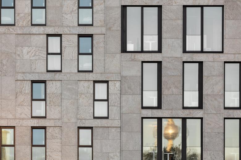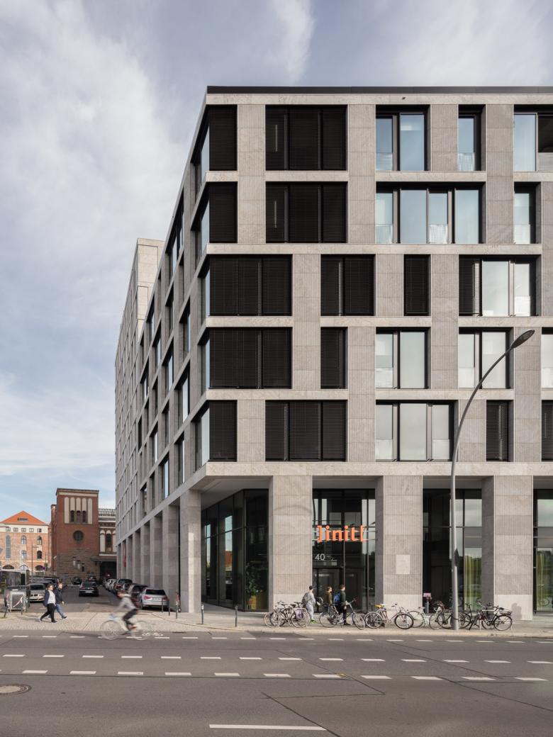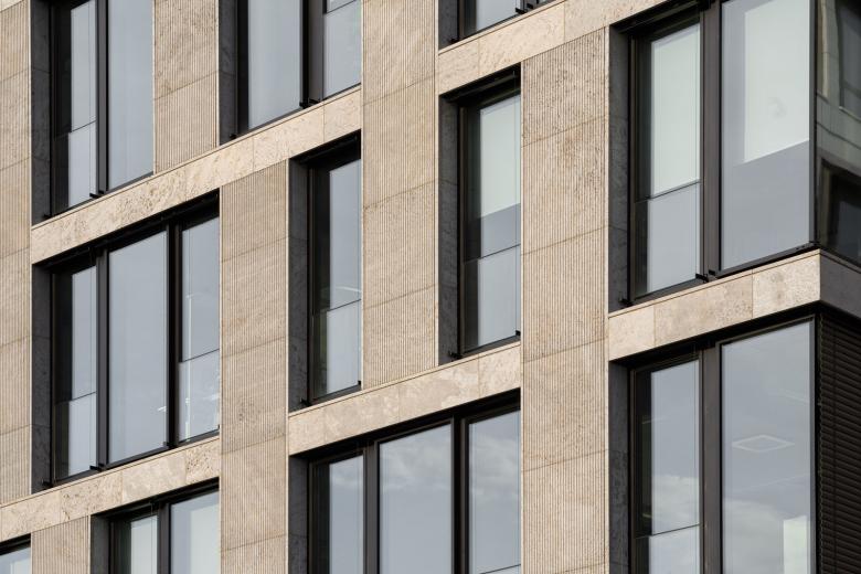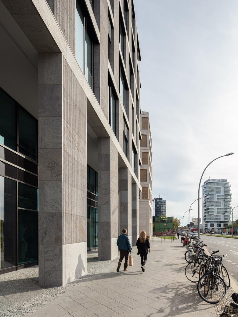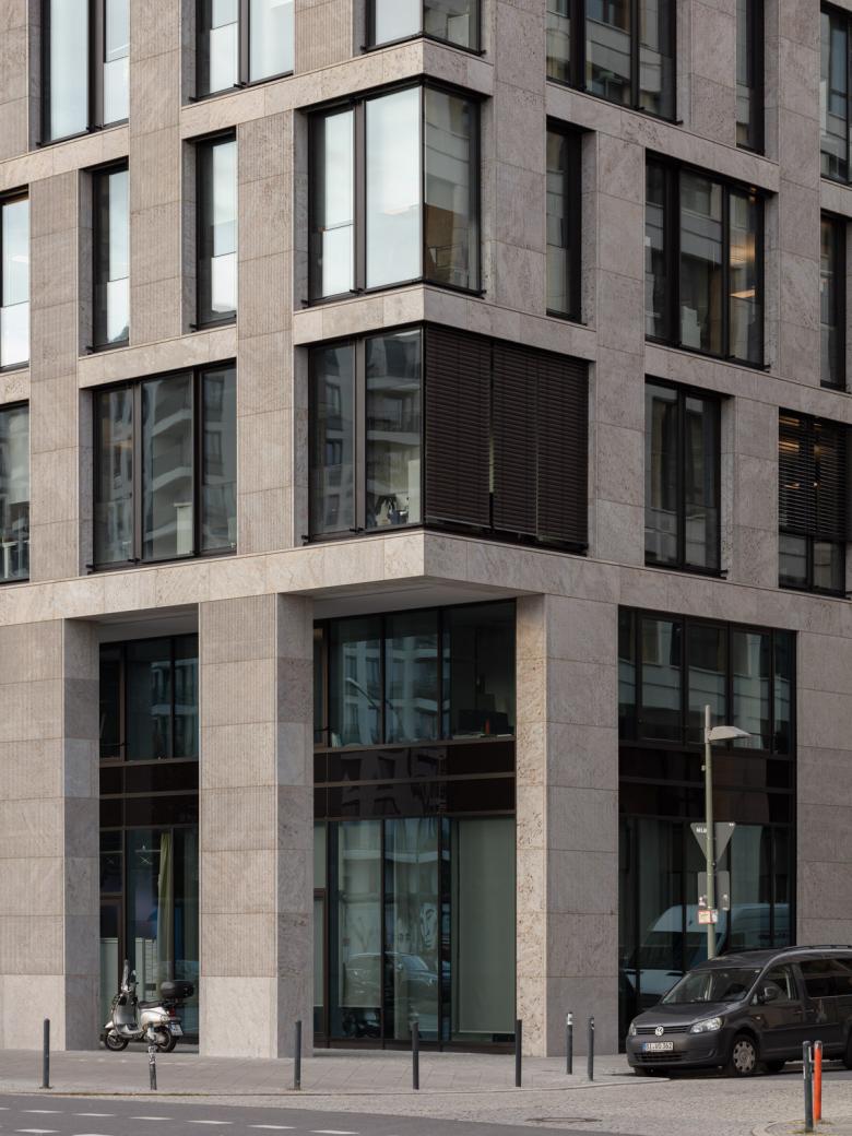 Wie beim benachbarten Hotel besteht die Natursteinfassade des Bürohauses aus glatten Steinflächen aus geschliffenem, teilweise kanneliertem Kohlplatter Muschelkalk und ist in zwei Bereiche gegliedert: Einen zweigeschossigen Sockelbereich vom Erdgeschoss bis zum ersten Obergeschoss und die Fassade der darüber liegenden Regelgeschosse. Auch nimmt die Bürohausfassade die Fassadenstruktur des Hotels wieder auf, das Grundraster aus einander überlagernden Pilastern und Gesimsen wurde beibehalten. Zeichnet sich die Hotelfassade jedoch aufgrund der gewünschten Privatheit der Hotelzimmer durch einen großen Natursteinanteil bei verhältnismäßig schmalen Fenstern aus, so wurden für das Bürogebäude große, raumhohe Glasflächen angeordnet, die die Fassade transparent öffnen und in den Büros für eine lichtdurchflutete Arbeitsumgebung sorgen sowie straßenseitig einen Panoramablick über die Spree und das Kreuzberger Ufer ermöglichen.