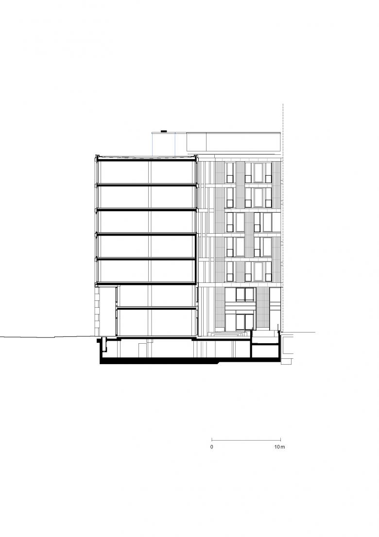 Das neue siebengeschossige Bürohaus Spreeoffice komplettiert ein Baufeld in dem sich rapide entwickelnden Büro- und Dienstleistungsstandort rund um den Berliner Ostbahnhof im Stadtteil Friedrichshain. Das Grundstück ist Teil des Geländes am historischen Postbahnhof und liegt in direkter Nähe zur East-Side-Gallery, dem längsten noch erhaltenen Teilstück der Berliner Mauer sowie unweit der 2008 eingeweihten Mercedes-Benz-Arena. Zusammen mit einem kurz zuvor fertig gestellten Hotelgebäude bildet das Bürogebäude in Kubatur und Materialität eine gestalterische Einheit.