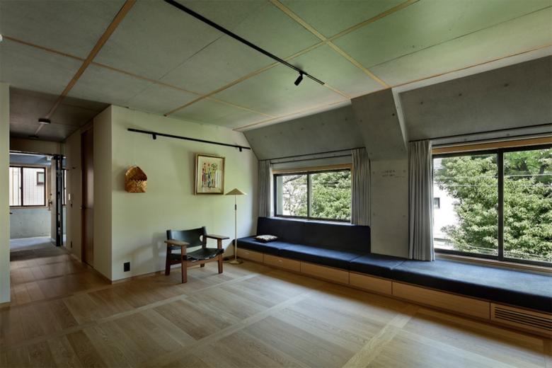 そこで我々は、何世代でも永く住み継がれることのできる住宅を計画。将来内装を変更した場合でも計画しやすいようにシンプルな躯体形状とした。敷地北側には道路を挟んで能楽堂裏の公園があり、各部屋が公園の緑を享受できるようにレイアウトを計画した。