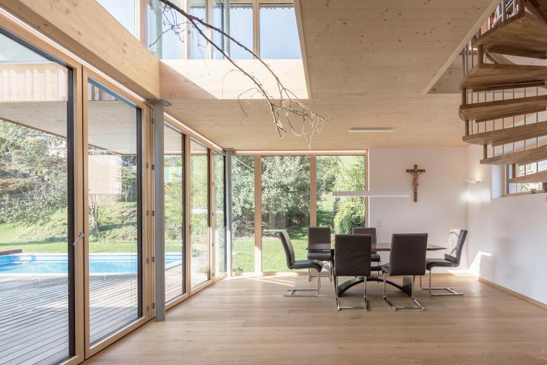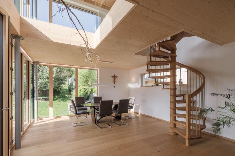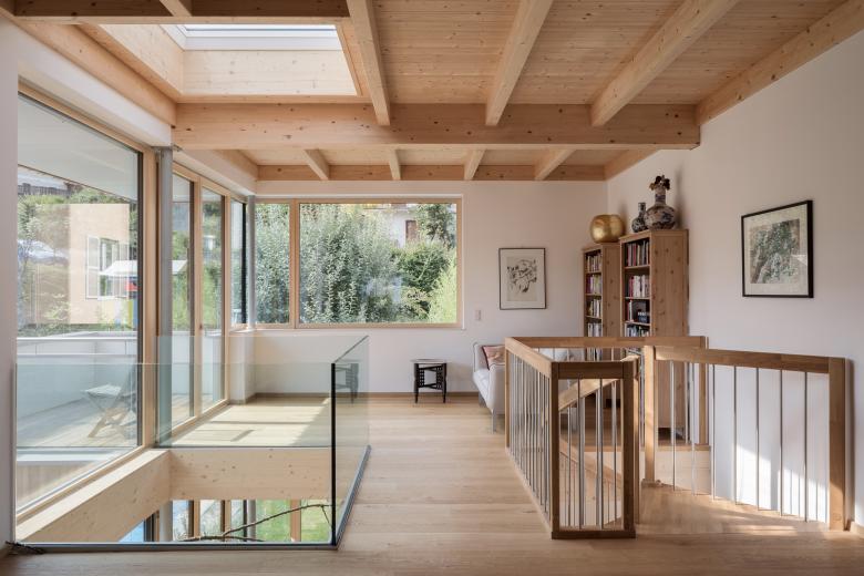 Außen schlicht und eher zurückhaltend, dominiert im Inneren der natürliche Baustoff Holz, der durch seine Haptik und handwerkliche Ausführung ein besonderes Raumgefühl entstehen lässt. Hier fühlt man sich wie in einer Schatulle, in der man seine schönsten und wertvollsten Sachen aufbewahrt, eingebettet in Holz, in etwas, dass man gerne berührt. Zum privaten Gartenbereich öffnet sich diese Holzschatulle und fasst Garten, Terrassen, Luftraum und Balkon zu einem geschützten, privaten und lichtdurchfluteten Lebensraum zusammen.