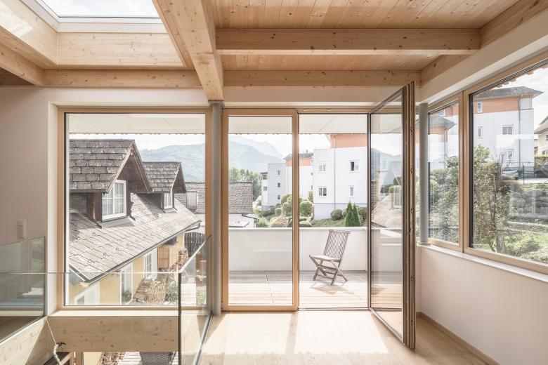 Ausgehend von einem neuen Wintergarten der sich in die bestehenden Raumfunktionen integriert, wuchs die Erweiterung zu einem 2-geschoßigen Anbau. Die Raumeinheiten der beiden angrenzenden Geschoße wurden neu strukturiert, um durch die offene, lichtdurchflutete Raumerweiterung den gewünschten Bezug zum Garten zu ermöglichen. Großzügige Fensteröffnungen lassen viel Licht in das Gebäudeinnere und gewährleisten, unterstützt durch den eingeschnittenen Luftraum, dass in beiden Geschoßen der umliegende Naturraum auch im Inneren spürbar und erlebbar wird.