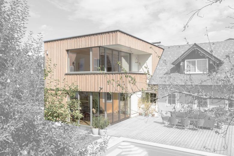 Die Lärchen-Holzschalung verleiht dem Anbau eine natürliche Eigenständigkeit und präsentiert sich gegenüber dem Bestandsgebäudes mit verputzter Wärmedämmfassade als ein starkes und selbstbewusstes Gegenüber.