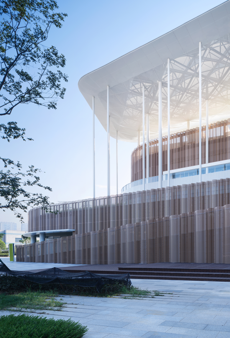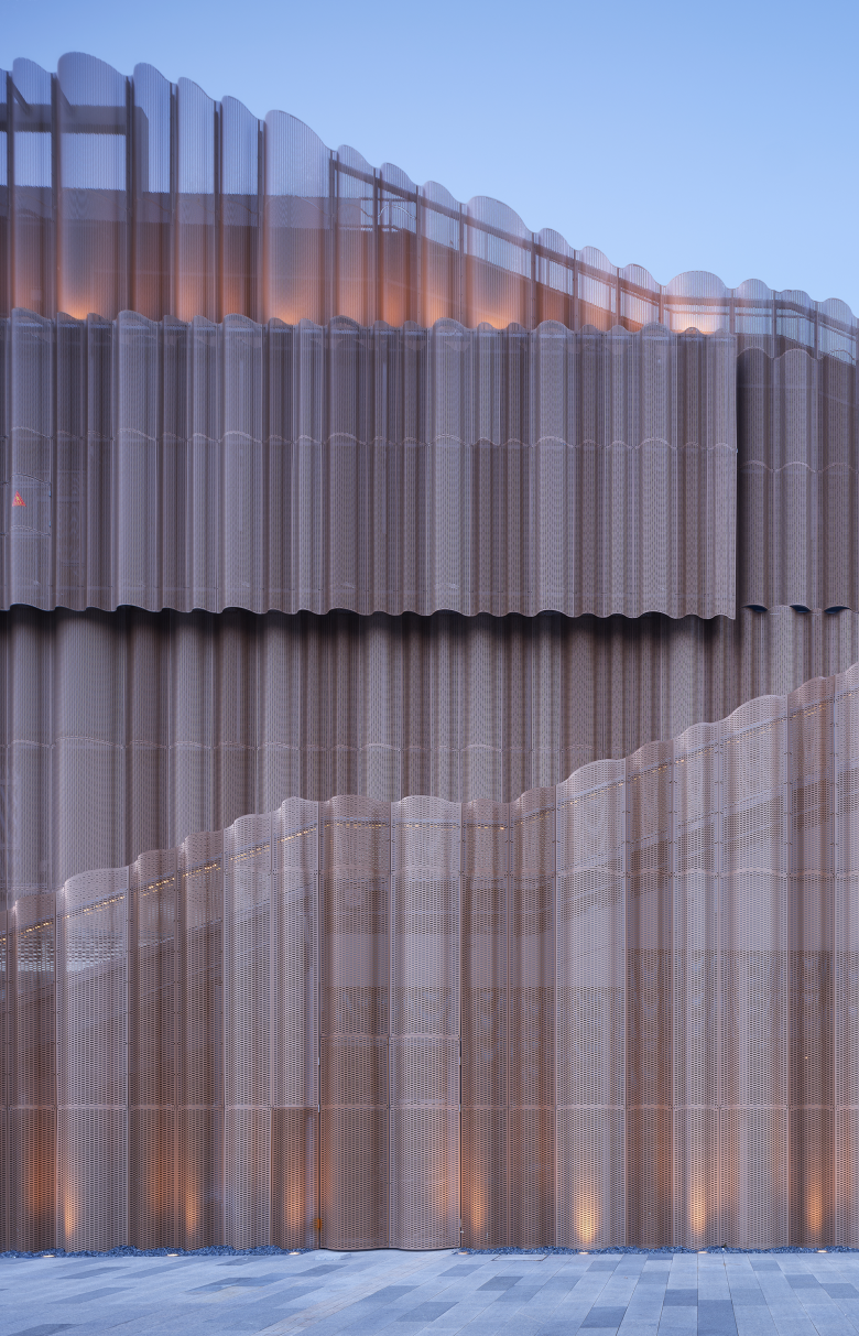 The venues are woven together through a ribbon of public platforms on the second floor and connected to the city streets as part of the street network. The architectural facade extracts curvilinear elements from traditional cultural symbols such as silk belts, scrolls and tile roofs, and uses curved perforated aluminum plate material to create the image of Jiangnan with continuous waves. The perforated patterns in different proportions and forms of the perforated aluminum plate give the facade a unique technical rhythm, a continuation of the traditional textile craftsmen’s poetry, and arouse the public’s memory of regional culture.