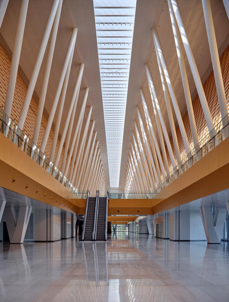 The largest hall in the trading center, Hall No. 1, covers an area of approximately 10,000 m2. Its column grid measures 75m (north-south) × 122.1m (east-west). The architecture features interconnected east-west curved roofs. Conventionally, bowstring beams are arranged along the curvature of the roof surfaces as the structural solution. In this design, main exhibition halls adopt an innovative top-supported steel bowstring arch truss system. This structural system successfully resolves three key challenges: out-of-plane instability of cable-braced systems, exposed HVAC duct at the roof, and structural support for the cantilevered roof profiles on both sides. The top-supported bowstring arch truss, in conjunction with the longitudinal curvature of the architectural roof, create an expressive interior space reminiscent of a hyperbolic dome. The central hall, serving as the core space for exhibition and trading, has a maximum height of approximately 23.7 meters. The design features vertically arranged V-shaped inclined columns on both sides of the central atrium, converging at the curved metal roof. The structural column arcade takes on a prominent role within the space. With the change of light and shadow in a day, the light shed by the roof skylight projected onto the arcade creates a flowing light and shadow, blending light, structure, and space into a harmonious unity.