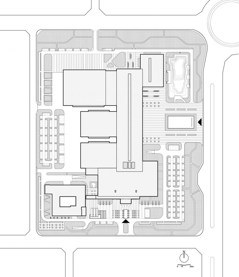 Conventional exhibition buildings, with their singular functionality and immense size, often become "islands" within the urban landscape, leading to a fragmentation of urban space. The design approaches the site from a broader urban perspective: the north and west sides of the site lie dense residential communities, while the eastern side borders the Pearl Lake Park. The main entrance is situated on the eastern side along the 18th Bohai Road, aligned with the long side of the site. This configuration not only creates an concentrated image display facade facing the city but also brings a core urban celebration plaza, providing citizens with a vibrant space for activities, celebrations, and gatherings.