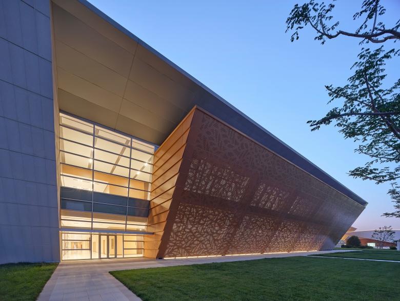 The design learns from traditional folk crafts such as paper-cutting and weaving, evoking the cultural essence of the Yellow River through sculptural forms and texture treatment. The eastern facade, facing the main square, features an extensive golden woven texture, creating a rhythmic overall image. It presents a variety of architectural images under different sunlight exposure and angles.