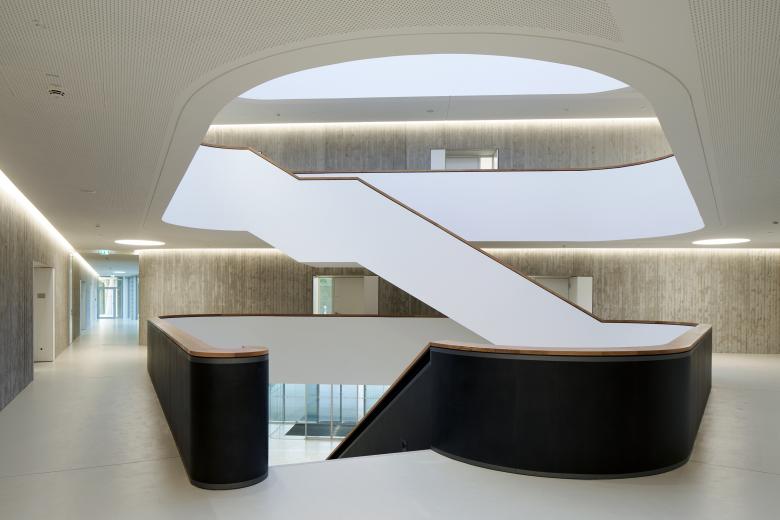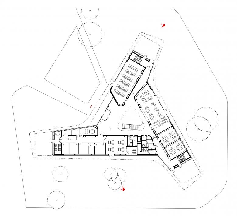 Um die beeindruckend großzügigen Grünflächen maximal zu schonen, wurde das Gebäude dreigeschossig konzipiert. Weit in das Grün auskragende Flügelenden erzeugen einen leichten, schwebenden Charakter. Die beiden schwebenden, großzügig verglasten Obergeschosse nehmen die Unterrichtsräume auf, das Erdgeschoss die »öffentlichen« Funktionen.