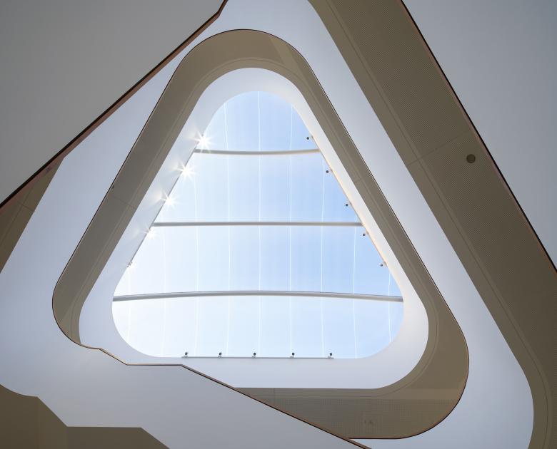 Eine vorgesetzte »zweite Haut« schützt das Gebäude vor Sonneneinstrahlung und kann zusätzlich als Wartungsgang genutzt werden. Raumhohe, schwenkbare Sonnenschutzelemente in Verbindung mit der geschwungenen Gebäudeform erzeugen ein lebendiges, abwechslungsreiches Erscheinungsbild, das die Kontinuität von Landschaftsraum und Gebäude weiter betont.