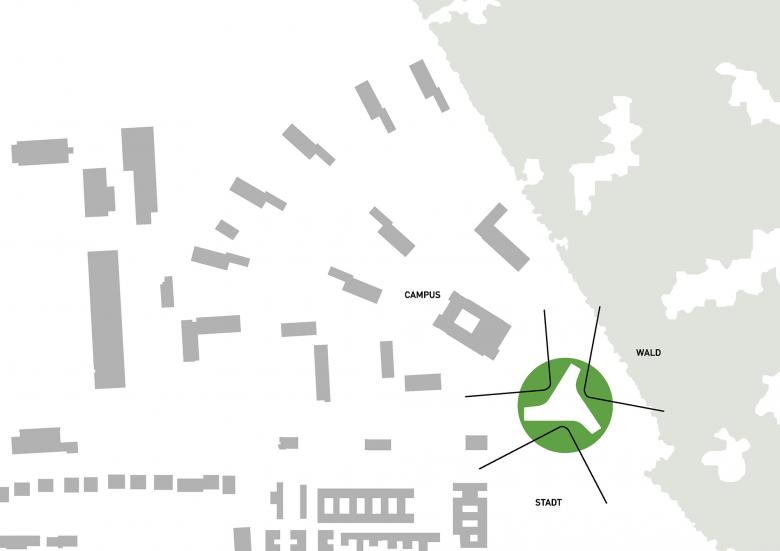 Der Neubau der Bundeswehrfachschule liegt im Randbereich des parkartigen Geländes der General-Fahnert-Kaserne. Die den Kontext prägenden Themen »Stadt – Wald – Kaserne« haben die Formfindung gelenkt. Das Ergebnis des Entwurfsprozesses ist ein dreiflügeliges Gebäude, dessen Seiten mit dem jeweiligen Gegenüber kommunizieren. Der neue Bildungsbau zeigt sich als identifikationsstiftender Solitär im Park, der sich durch seine städtebauliche Ausformulierung wie selbstverständlich in den Campus einfügt.