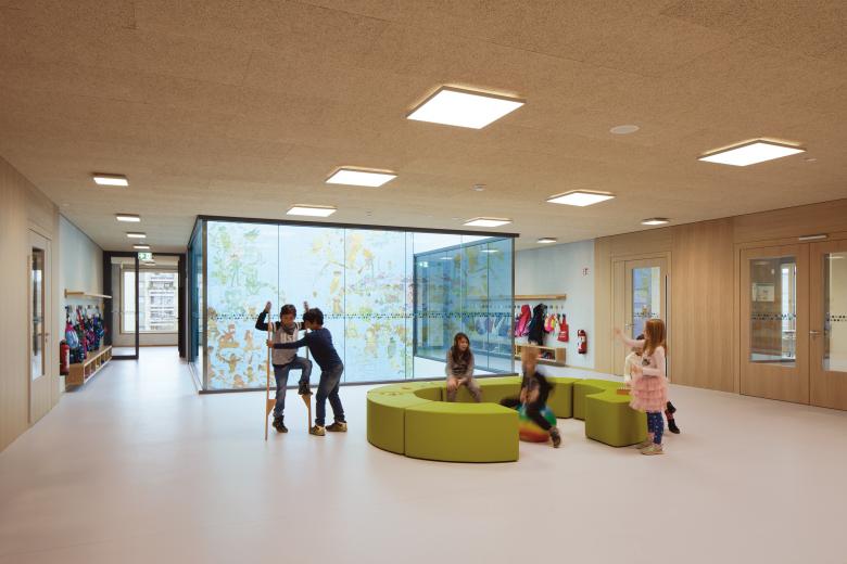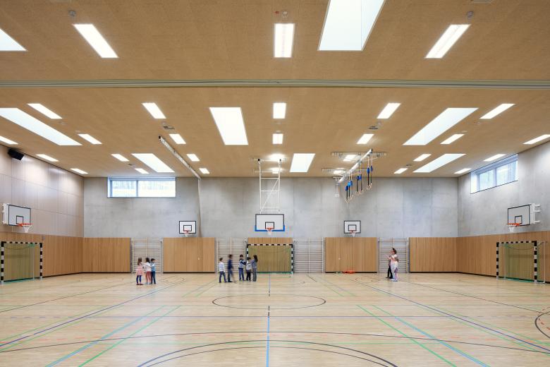 Zwischen der Sporthalle und dem Lernhaus wurde eine neue Eingangssituation für die Grundschule geschaffen. Der Fußweg Echardinger Straße weitet sich zu einem öffentlichem Vorplatz auf, der als sicherer Vorbereich in ausreichender Entfernung zur stark befahrenen Berg-am-Laim-Straße die Erschließung der Grundschule deutlich verbessert.