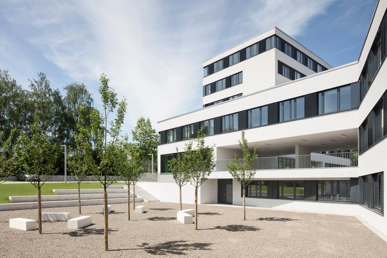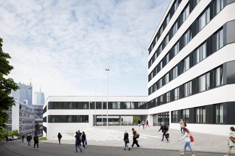 Die Gebäudefigur umschliesst zwei neue Freiräume mit unterschiedlichen Charakteren: Der repräsentative, städtische Vorplatz am Nordturm orientiert sich zur fußläufigen Haupterschließung der Universität und öffnet sich zum Landschaftsraum nach Osten, auf der anderen Seite richtet sich ein ruhiger Gartenhof zur „grünen Mitte“ des Campus nach Westen aus. Vernetzt werden diese Räume über die Campus-Loggia, die mittels einer Außentreppe eine offene Verbindung zum Gartenhof schafft.