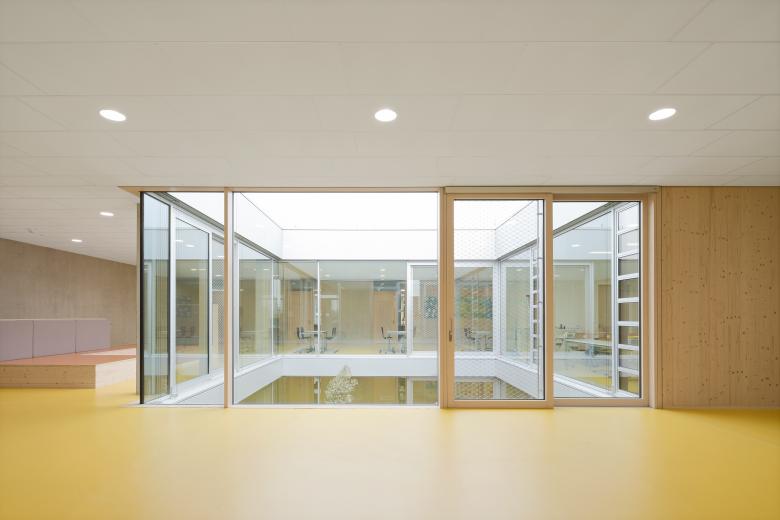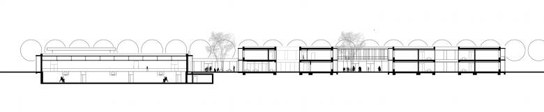 Ein Ensemble von Klassenhäusern erweitert den Bestand. Die Pavillonstruktur mit differenzierten Außenräumen ergänzt die bestehenden Kultureinrichtungen um ein zentrales Forum - dem neuen Herz des Schulzentrums.