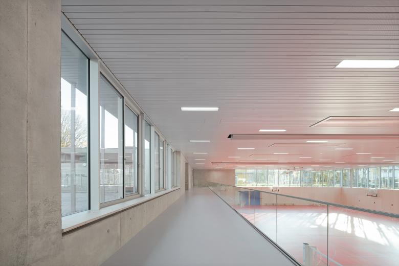 Das zwischen der Sporthalle und dem Saal des Kulturzentrums gelegene Foyer wird um die Forumsnutzungen nach Süden erweitert und bildet das neue Herz und den Haupteingang der Schule. Die Unterrichtsräume gruppieren sich in versetzt angeordneten Pavillions um jeweils eigene grüne Höfe. Die Anordnung der Schulbaukörper erzeugen im Zusammenspiel mit dem Rolf-Engelbrecht-Haus ein vielfältig nutzbares differenziertes Freiraumangebot.
