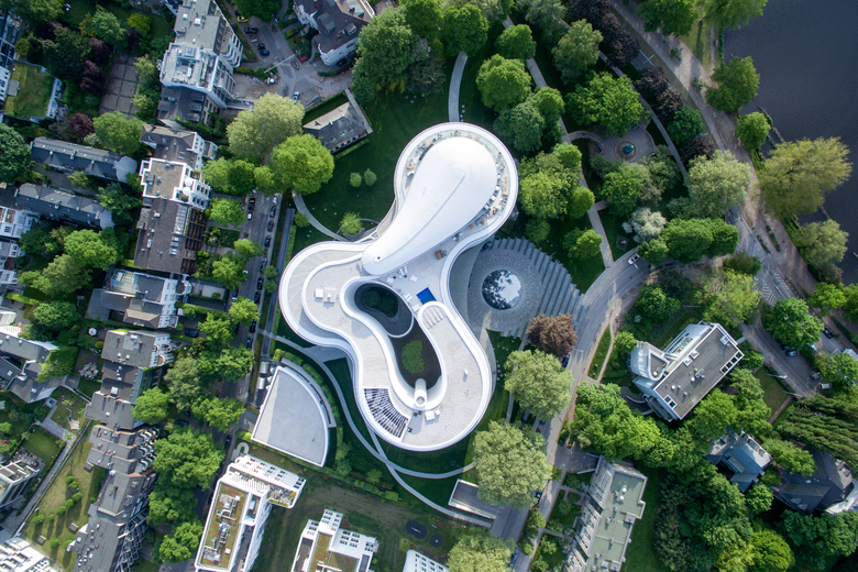 Das Grundmotiv sind sanft und ruhig geschwungene Rasenflächen, bestanden mit malerischen Parkbäumen. Nach Norden, Süden und Westen rahmen lineare Hecken-Parterres das Grundstück und bilden den stadträumlichen Anschluss. Eines der drei Objekte ist ein hochglanzpoliertes Steinelement, das die Reflexion des Lichtes, des Wassers und des Himmels verstärkt und eine reduzierte Assoziation an die herrschaftlichen Parterre-Anlagen historischer Villen und Schlösser bildet.