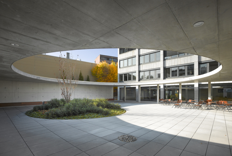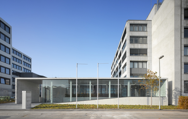 Um auf diese Situation zu antworten, wurde neben das vorhandene Gebäude der GFT ein autonomer, eingeschossiger Baukörper gesetzt, der sich funktional an den Bestand anfügt. Die Position des Neubaus definiert bewusst einen hinteren, in Richtung Westen orientierten, introvertierten Außenraum. Die Erweiterung bindet das Gebäude vorne an die Schelmenwasenstraße an, wo eine Rampe adressbildend den neuen Haupteingang definiert.