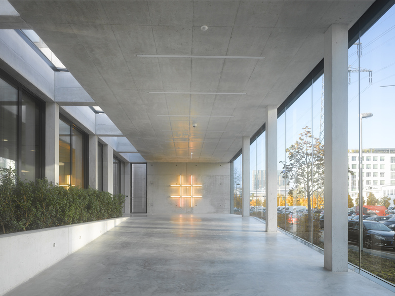 Über die Rampe im vorgelagerten Glaskubus werden das Restaurant sowie das Foyer erschlossen; die Flächen für Ausstellungsbereich, Firmenpräsentation sowie für die Besprechungszimmer sind hier direkt angebunden.