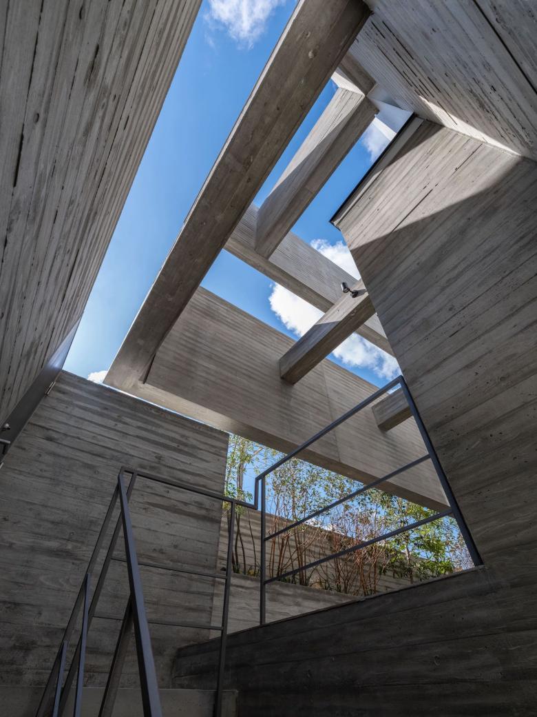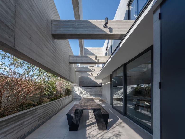 The first-floor LDK adjoins a spacious south-facing terrace. Opening the 3.3m-wide sliding doors integrates the LDK and terrace into a single unified space.A planter approximately 10m long runs along the south side of the terrace, creating a space to enjoy seasonal plantings and activities like barbecues.Furthermore, a 1.8m wall encircling the terrace blocks horizontal sightlines. To address views from the apartment block, rather than roofing the terrace, a two-tiered cantilevered wall encircles the terrace's upper section from the second floor and roof slab. This ensures privacy while creating an open, sculptural space with a sense of openness to the sky.Furthermore, the floating walls encircling the terrace are deliberately offset. The gaps created by this offset allow fragmented light to filter through and wind to pass, imbuing the terrace with a sense of time within space.