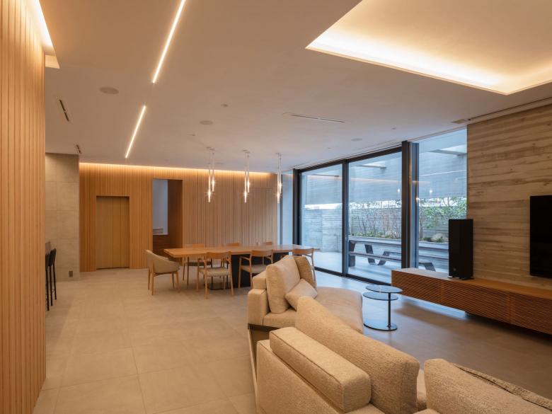 This project is a reinforced concrete structure comprising one basement level and two above-ground storeys. As the site's ground level is 4 metres higher than the front road, access to the building is via the basement.Both the approach and the entrance hall feature a double-height space, creating an open, light-filled atmosphere despite being underground.Upon entering the approach, a timber-clad wall appears. This wall continues upwards, traversing the first-floor living-dining-kitchen area and extending to the stairwell on the second floor.This timber cladding is installed with a distinctive textured pattern, creating varied expressions through the interplay of natural and artificial light. This approach preserves the warmth inherent in the wood while allowing each area to develop its own character, resulting in a richly textured space.