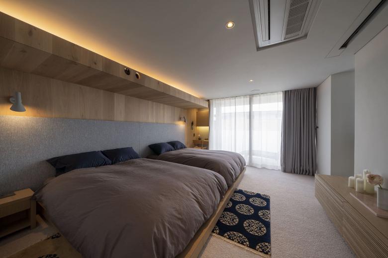 The master bedroom is a tranquil space with oak panelled walls and slightly muted white walls, offering a convenient layout with an adjoining powder room of comparable size. The guest rooms are twin Japanese-style rooms centred around a circular opening in the courtyard ceiling. These twins, borrowing each other's scenery, each bring a serene worldview and depth to the other's existence. Particularly distinct is the basement bar. Centred around a counter clad in oxidised copper for character, it employs antique brick, velvet curtains, and dark mirrors to evoke a 1970's aesthetic. Neon signs glow with an eerie light.