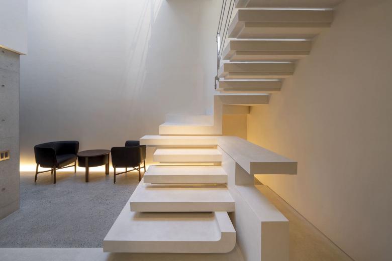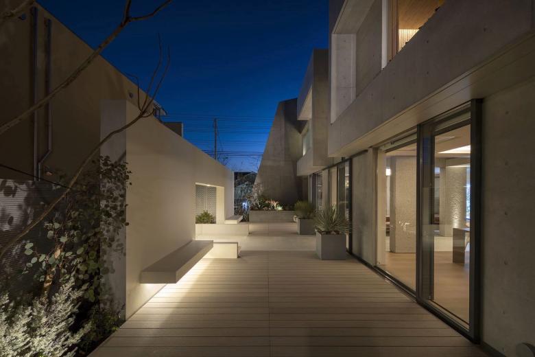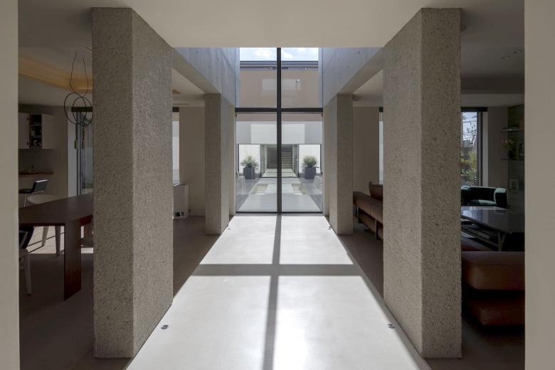 To realise the concrete mass born of the owner's strong request, and to imbue the diagonal cut shape following the northern slope line with meaning,the facade was conceived by combining three-dimensional forms, as if sculpting concrete itself. The resulting form comprises a surface inclined 7 degrees towards the road, vertical north-south planes, and two triangles connecting them. This sculpture, evoking a sense of wonder and sanctity, sits as if guarding the avenue lined with Chinese hackberry trees. The staircase first encountered at the entrance draws inspiration from the master architect Carlos Calpa. It represents a challenge to create complex three-dimensional forms in concrete, finished by grinding limestone mortar to aim for the staircase itself becoming an art piece.Upon ascending to the first floor, a simple, symmetrical plan unfolds, centred around four columns formed with a concrete bush hammer finish. Flanking these are the living and dining areas. A single path runs straight through the centre, piercing to the exterior, where a two-storey-high opening with an inverted cross-shaped frame, symbolically unifying the entire structure.