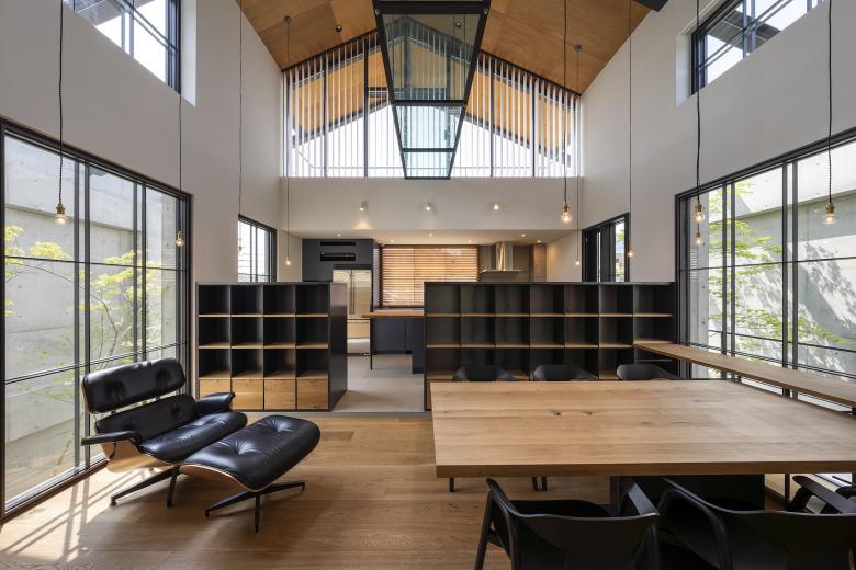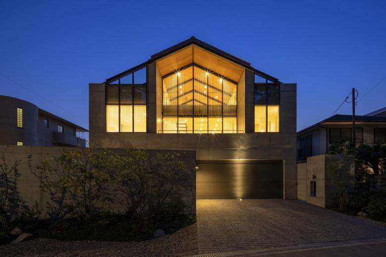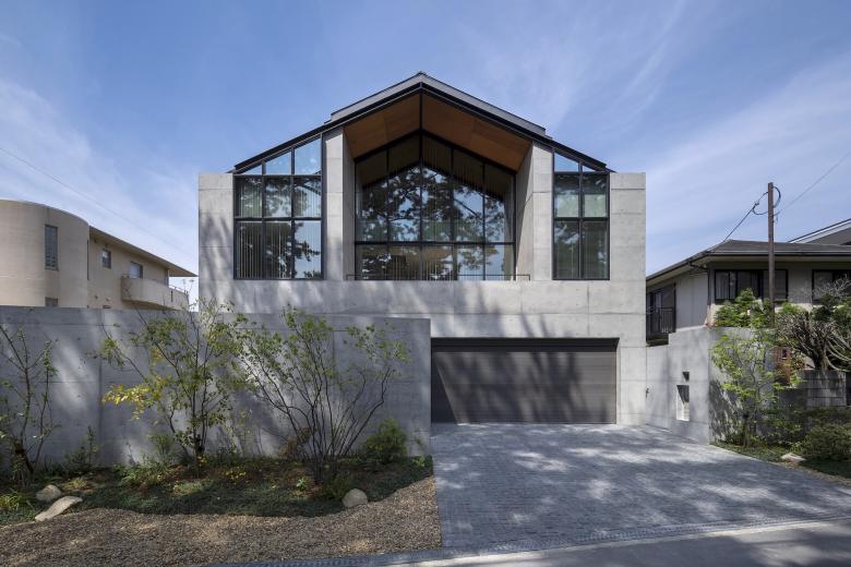 The design creates a fundamentally visible yet private environment by establishing a frontage facing the road as a lush open space incorporating parking and an approach.The exterior walls are finished entirely in exposed concrete, while the roof is gabled, spanning over H-beam girders. This combination of concrete and H-beam creates a dynamic impression.