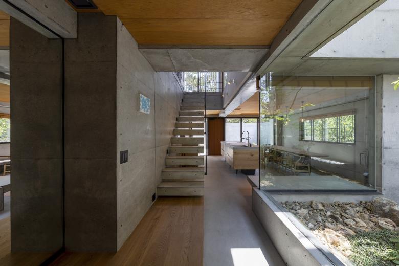 Internally, the space is defined by the expansive pine grove along the Shukugawa riverbank to the east, the Hankyu Railway tracks to the west, and two north-south courtyards on the western side. These courtyards act as privacy buffers, creating ambiguous transitional spaces between interior and exterior.