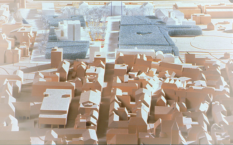 Der Grünbereich westlich der Esplanade wird als landschaftlich geprägter Park gestaltet. Er steht in einem spannungsvollen Gegensatz zur Esplanade. Eine Parkpasarelle schafft eine direkte Verbindung zur westlichen Innenstadt. Der Bahnhofsplatz bildet den Ausgangspunkt und Abschluss. Auf seiner Ostseite wird die fehlende räumliche Fassung durch ein Parkhaus und Sozialgebäude hergestellt. Der alte Friedhof erhält eine räumliche Umgrenzung durch eine semitransparente Lamellenwand und wird zu einem kontemplativen Rückzugsbereich.